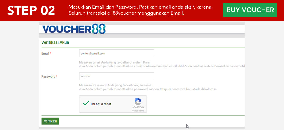 Masukkan Email dan Password. Pastikan email anda aktif, karena Seluruh transaksi di 88voucher menggunakan Email.